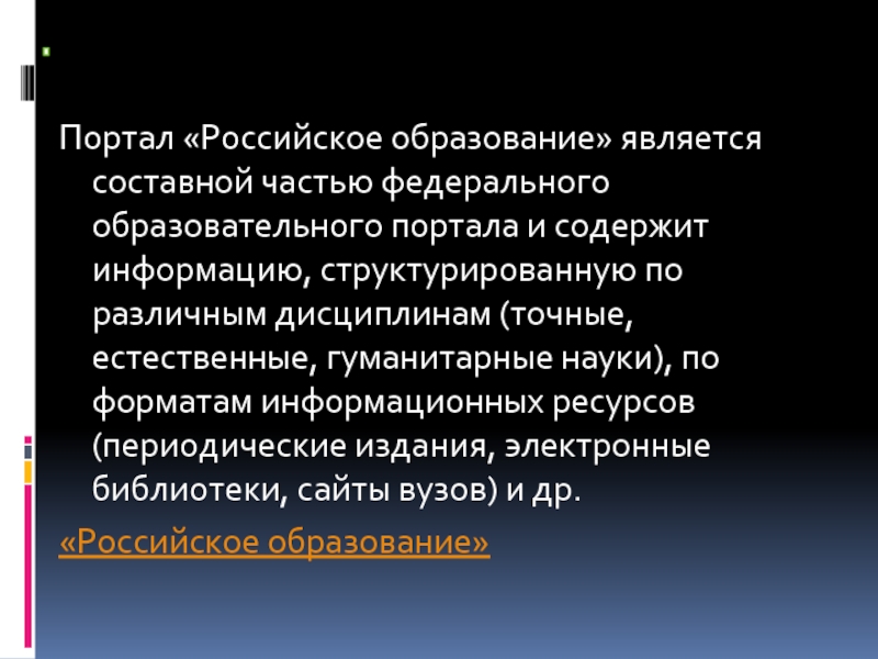 Портал «Российское образование» является составной частью федерального образовательного портала и содержит