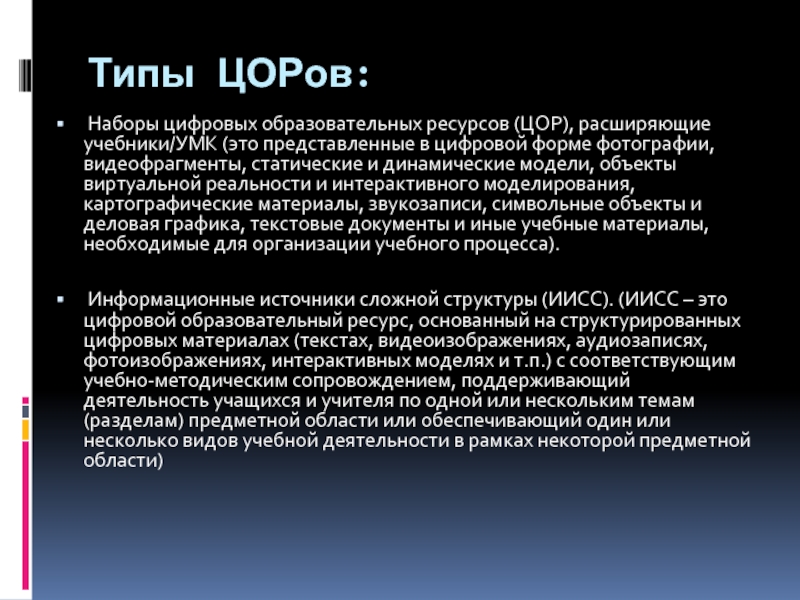 Информационные источники сложной структуры (ИИСС). (ИИСС – это цифровой образовательный ресурс, основанный на структурированных цифровых материалах (текстах, видеоизображениях, аудиозаписях, фотоизображениях, интерактивных моделях и т.п.) с соответствующим учебно-методическим сопровождением, поддерживающий деятельность учащихся и учителя по одной или нескольким темам (разделам) предметной области или обеспечивающий один или несколько видов учебной деятельности в рамках некоторой предметной области)