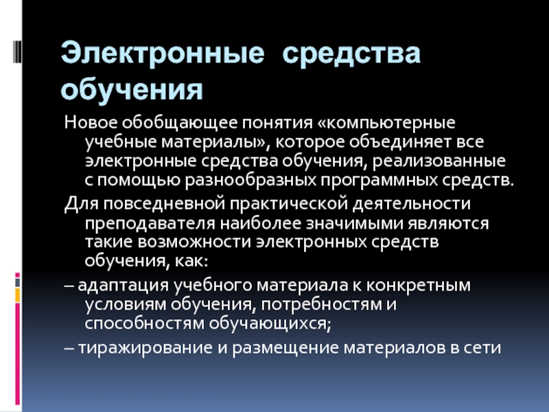 Для повседневной практической деятельности преподавателя наиболее значимыми являются такие возможности электронных средств обучения, как: