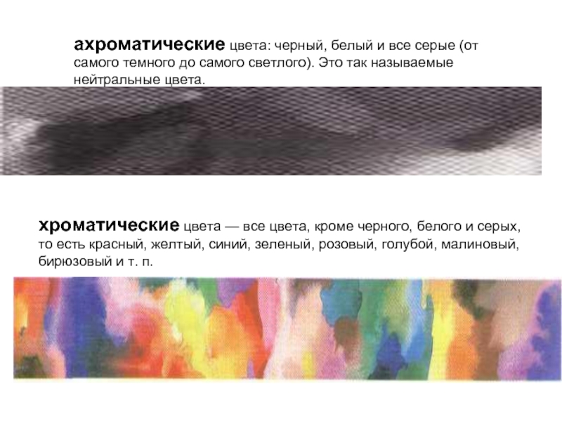 хроматические цвета — все цвета, кроме черного, белого и серых, то есть красный, желтый, синий, зеленый, розовый, голубой, малиновый, бирюзовый и т. п.