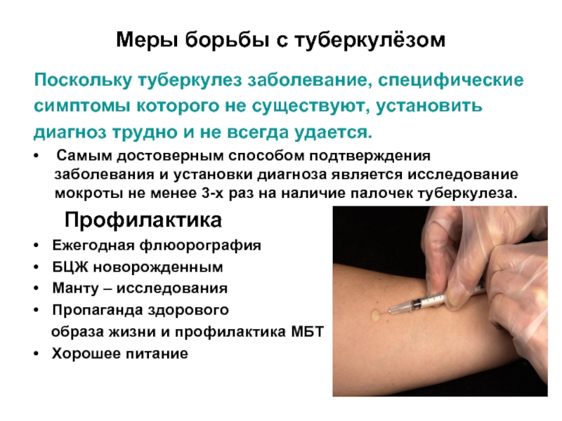 • Самым достоверным способом подтверждения заболевания и установки диагноза является исследование мокроты не менее 3-х раз на наличие палочек туберкулеза.