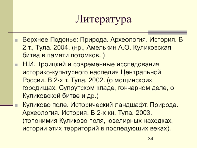 Н.И. Троицкий и современные исследования историко-культурного наследия Центральной России. В 2-х т. Тула, 2002. (о мощинскоих городищах, Супрутском кладе, гончарном деле, о Куликовской битве и др.)