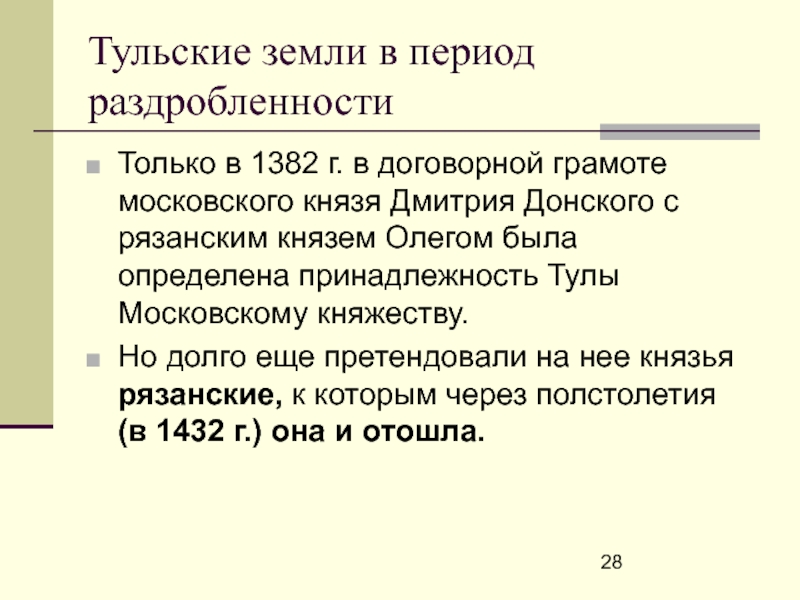 московского князя Дмитрия Донского с рязанским князем Олегом была определена принадлежность Тулы Московскому княжеству.