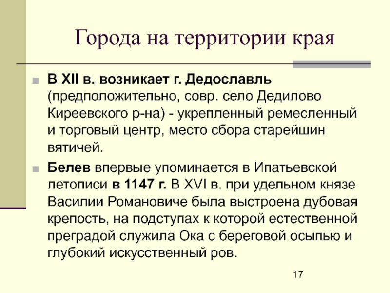 село Дедилово Киреевского р-на) - укрепленный ремесленный и торговый центр, место сбора старейшин вятичей.