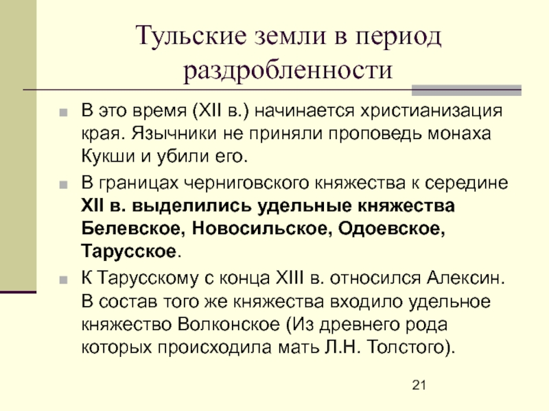 К Тарусскому с конца XIII в. относился Алексин. В состав того же княжества входило удельное княжество Волконское (Из древнего рода которых происходила мать Л.Н. Толстого).