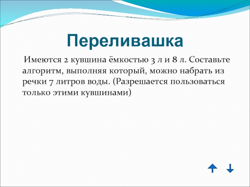 Составьте алгоритм, выполняя который, можно набрать из речки 7 литров воды. (Разрешается пользоваться только этими кувшинами)