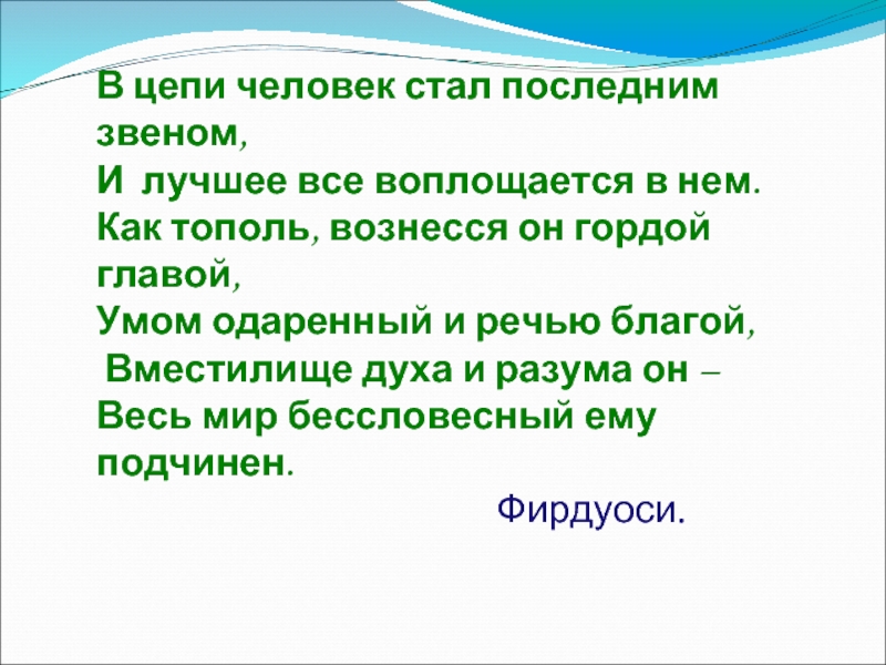 Слайд 2 В цепи человек стал последним звеном, И лучшее все воплощается в нем. Как