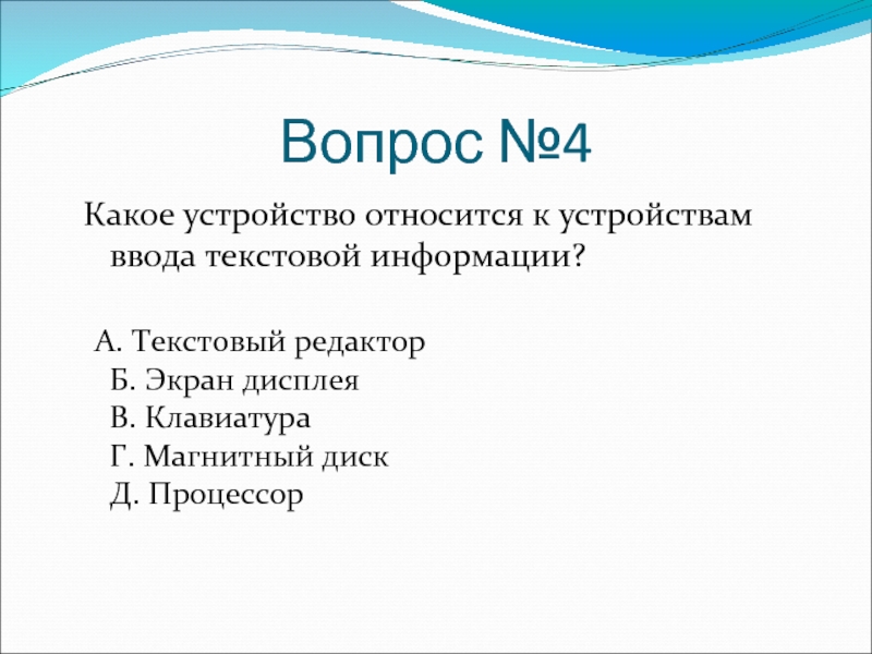 А. Текстовый редактор Б. Экран дисплея В. Клавиатура Г. Магнитный диск Д. Процессор