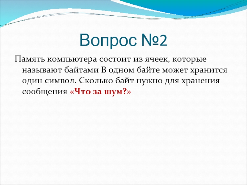 байте может хранится один символ. Сколько байт нужно для хранения сообщения «Что за шум?»