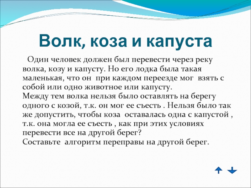через реку волка, козу и капусту. Но его лодка была такая маленькая, что он  при каждом переезде мог  взять с собой или одно животное или капусту. Между тем волка нельзя было оставлять на берегу одного с козой, т.к. он мог ее съесть . Нельзя было так же допустить, чтобы коза  оставалась одна с капустой , т.к. она могла ее съесть , как при этих условиях перевести все на другой берег? Составьте алгоритм переправы на другой берег.