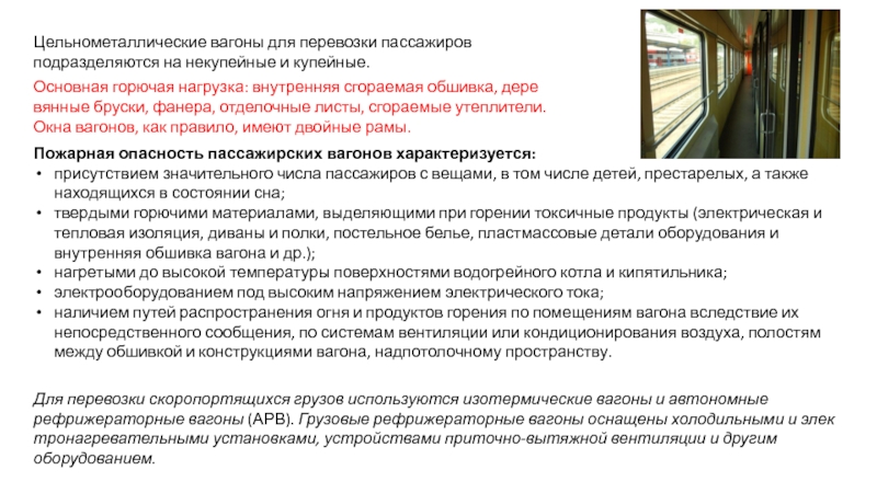 наличием путей распространения огня и продуктов горения по помещениям вагона вследствие их непосредственного сообщения, по системам вентиляции или кондиционирования воздуха, полостям между обшивкой и конструкциями вагона, надпотолочному пространству.