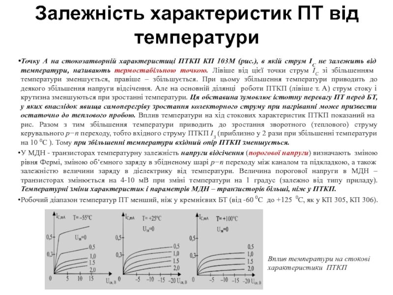 За формою вони аналогічні до вихідних характеристик ПТКП і зумовлені подібними процесами у каналі. Зміщення вихідних характеристик угору при збільшенні негативної напруги UЗВ >UЗВпер зумовлене розширенням каналу і зменшенням його електричного опору (зростанням струму стоку).
