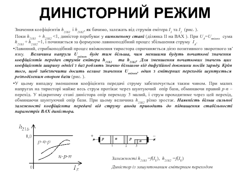 У цьому випадку зменшення коефіцієнта передачі струму забезпечується таким чином. При малих напругах на тиристорі майже весь струм протікає через шунтуючий опір бази, обминаючи правий p-n – перехід. У відкритому стані диністора опір переходу 3 малий, і струм проходитиме через цей перехід, обминаючи шунтуючий опір бази. При цьому величина h21Б2 різко зростає. Наявність більш сильної залежності коефіцієнта передачі від струму анода приводить до підвищення стабільності параметрів ВАХ диністора.