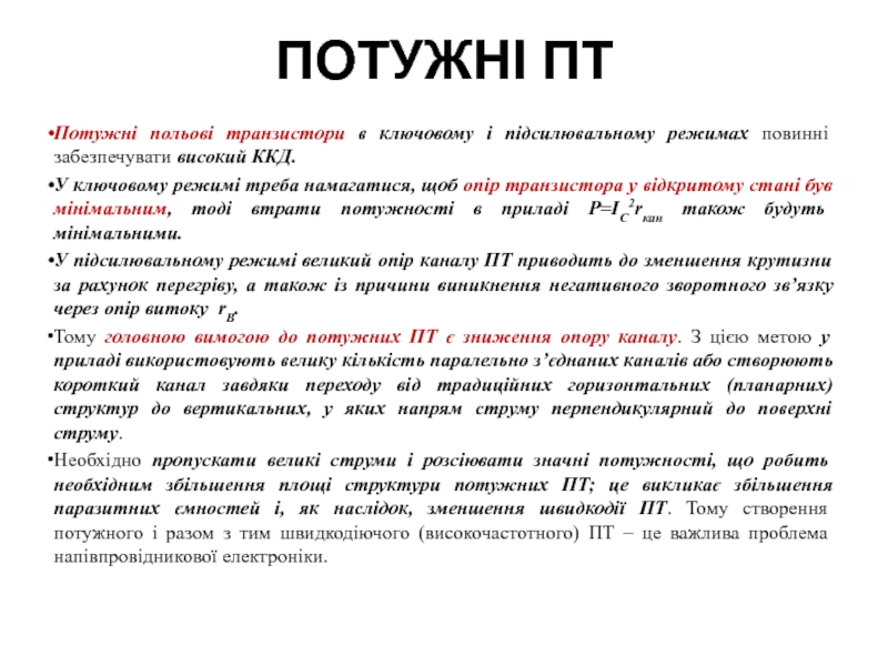 Слайд 4Польові транзистори (ПТ) – це напівпровідникові прилади, в яких протікання струму