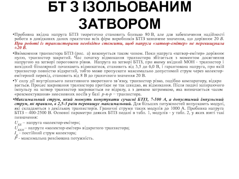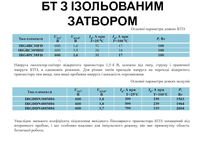 Максимальний струм, який можуть комутувати сучасні БТІЗ, 7-100 А, а допустимий імпульсний струм, як правило, в 2,5-3 рази перевищує максимальний. Для більших потужностей випускають модулі, які складаються з декількох транзисторів. Граничні струми таких модулів до 1000 А. Пробивна напруга БТІЗ – 400-2500 В. Основні параметри деяких БТІЗ подані в табл. 1, модулів - у табл. 2, у яких взяті такі позначення: