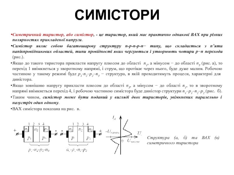 Структура (а, б) та ВАХ (в) симетричного тиристора