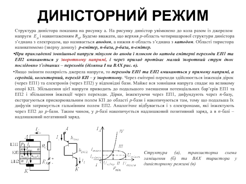 Поки h21Б1 + h21Б2 <1, диністор перебуває у вимкненому стані (ділянка II на ВАХ ). При UA=Uввімкн сума h21Б1 + h21Б2=1, і починається за формулою лавиноподібний процес збільшення струму IA.