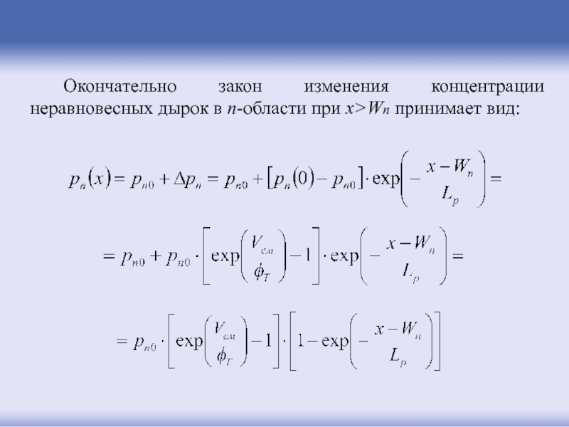 Слайд 6Окончательно закон изменения концентрации неравновесных дырок в n-области при x>Wn принимает