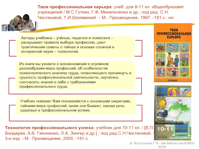 Твоя профессиональная карьера: учеб. для 8-11 кл. общеобразоват. учреждений / М.С.Гуткин, Г.Ф. Михальченко и др.; Под ред. С.Н.Чистяковой, Т.И.Шалавиной. – М.: Просвещение, 1997. -191 с.: ил.
