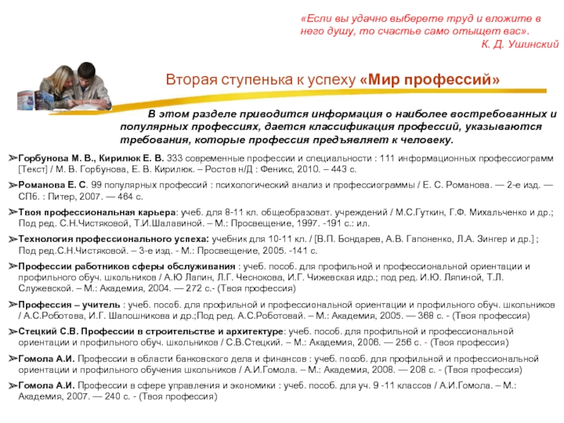 Горбунова М. В., Кирилюк Е. В. 333 современные профессии и специальности : 111 информационных профессиограмм [Текст] / М. В. Горбунова, Е. В. Кирилюк. – Ростов н/Д : Феникс, 2010. – 443 с.