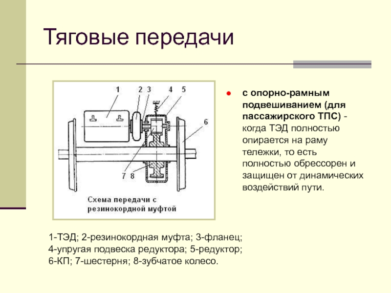 При опорно-рамном подвешивании - ТЭД полностью опирается на раму тележки, то есть полностью обрессорен и защищен от динамических воздействий от пути.