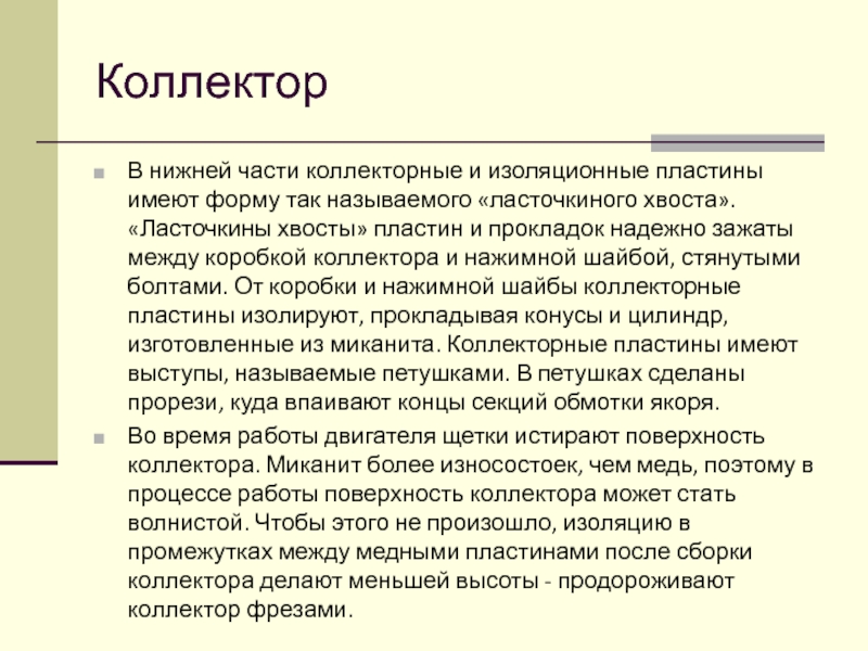 «ласточкиного хвоста». «Ласточкины хвосты» пластин и прокладок надежно зажаты между коробкой коллектора и нажимной шайбой, стянутыми болтами. От коробки и нажимной шайбы коллекторные пластины изолируют, прокладывая конусы и цилиндр, изготовленные из миканита. Коллекторные пластины имеют выступы, называемые петушками. В петушках сделаны прорези, куда впаивают концы секций обмотки якоря.