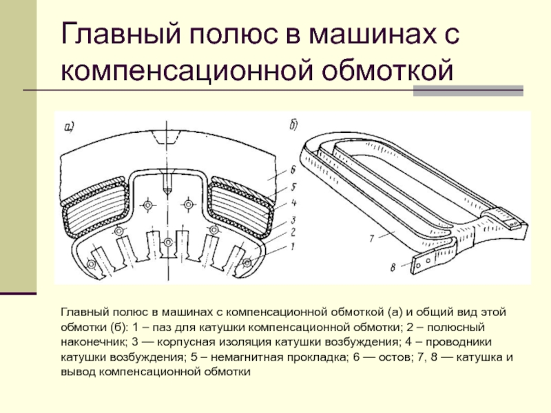 компенсационной обмоткой (а) и общий вид этой обмотки (б): 1 – паз для катушки компенсационной обмотки; 2 – полюсный наконечник; 3 — корпусная изоляция катушки возбуждения; 4 – проводники катушки возбуждения; 5 – немагнитная прокладка; 6 — остов; 7, 8 — катушка и вывод компенсационной обмотки