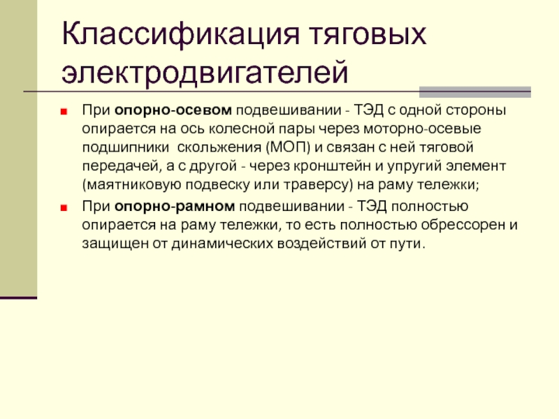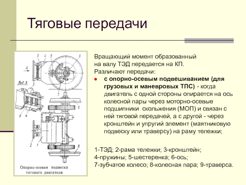 подвешиванием (для грузовых и маневровых ТПС) - когда двигатель с одной стороны опирается на ось колесной пары через моторно-осевые подшипники скольжения (МОП) и связан с ней тяговой передачей, а с другой - через кронштейн и упругий элемент (маятниковую подвеску или траверсу) на раму тележки;