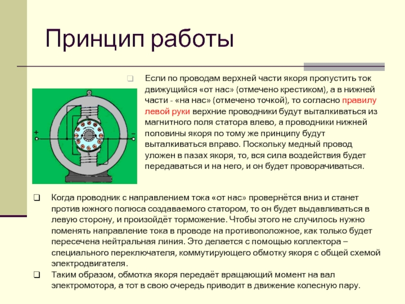 нас» (отмечено крестиком), а в нижней части - «на нас» (отмечено точкой), то согласно правилу левой руки верхние проводники будут выталкиваться из магнитного поля статора влево, а проводники нижней половины якоря по тому же принципу будут выталкиваться вправо. Поскольку медный провод уложен в пазах якоря, то, вся сила воздействия будет передаваться и на него, и он будет проворачиваться.