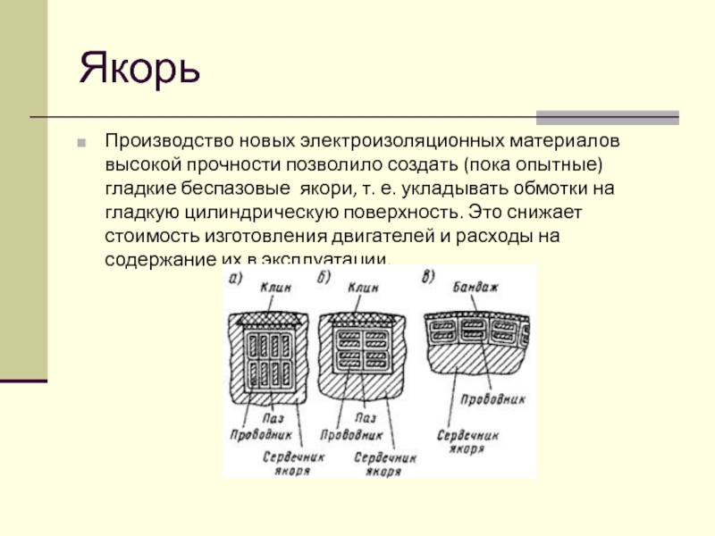 беспазовые якори, т. е. укладывать обмотки на гладкую цилиндрическую поверхность. Это снижает стоимость изготовления двигателей и расходы на содержание их в эксплуатации.