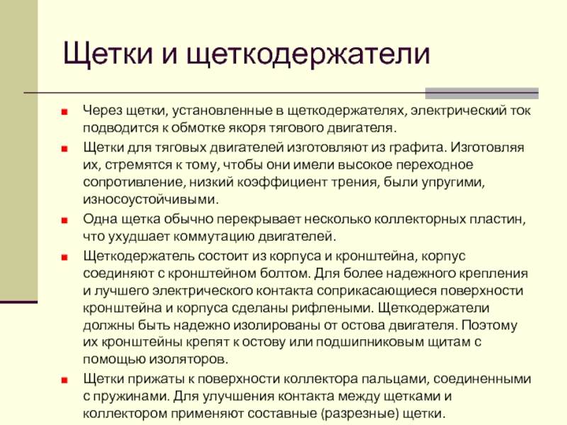 Щетки для тяговых двигателей изготовляют из графита. Изготовляя их, стремятся к тому, чтобы они имели высокое переходное сопротивление, низкий коэффициент трения, были упругими, износоустойчивыми.