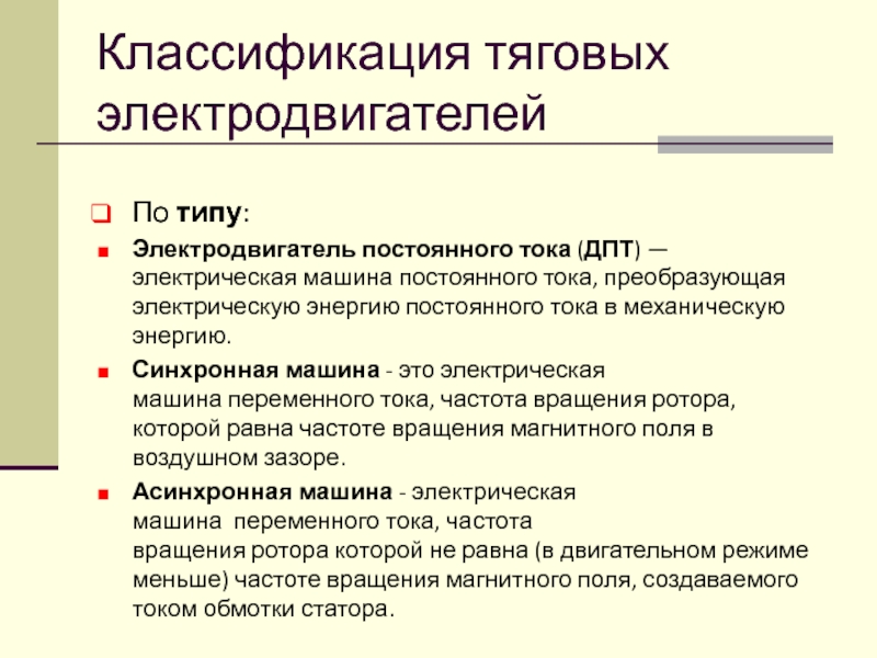 Слайд 13Классификация тяговых электродвигателей