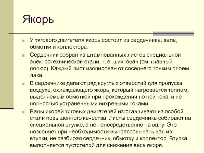 У тягового двигателя якорь состоит из сердечника, вала, обмотки и коллектора.