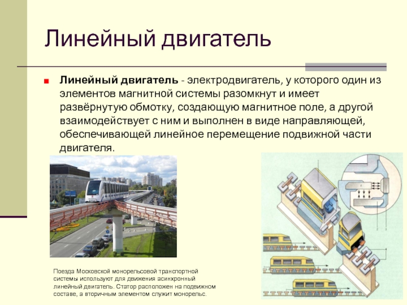 Поезда Московской монорельсовой транспортной системы используют для движения асинхронный линейный двигатель. Статор расположен на подвижном составе, а вторичным элементом служит монорельс.