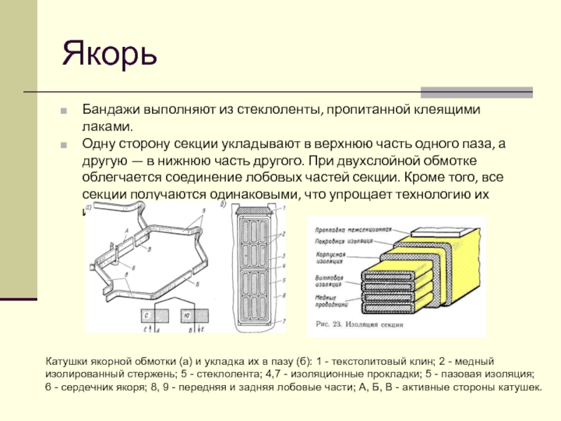 6 - сердечник якоря; 8, 9 - передняя и задняя лобовые части; А, Б, В - активные стороны катушек.
