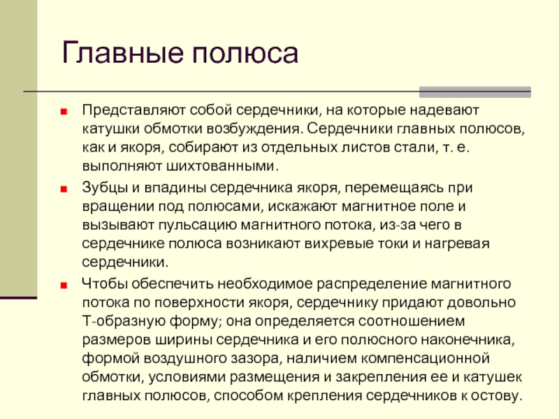 Чтобы обеспечить необходимое распределение магнитного потока по поверхности якоря, сердечнику придают довольно Т-образную форму; она определяется соотношением размеров ширины сердечника и его полюсного наконечника, формой воздушного зазора, наличием компенсационной обмотки, условиями размещения и закрепления ее и катушек главных полюсов, способом крепления сердечников к остову.
