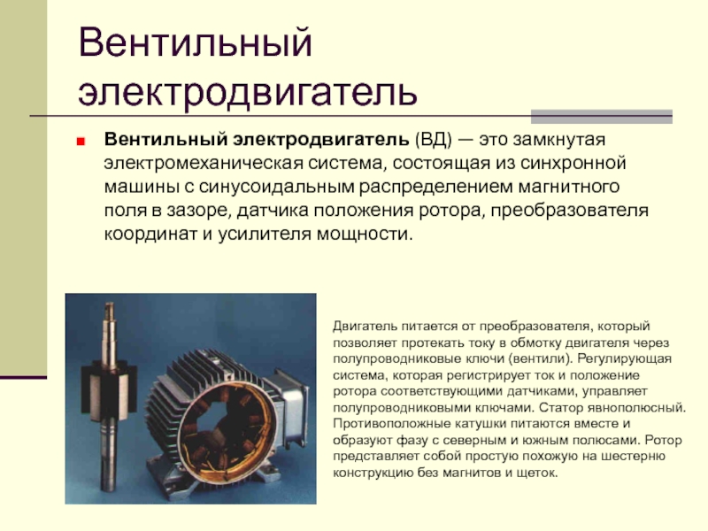 Вентильный электродвигатель (ВД) — это замкнутая электромеханическая система, состоящая из синхронной машины с синусоидальным