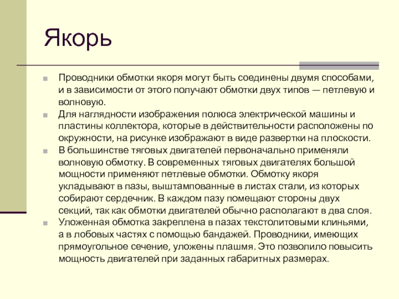 В большинстве тяговых двигателей первоначально применяли волновую обмотку. В современных тяговых двигателях большой мощности применяют петлевые обмотки. Обмотку якоря укладывают в пазы, выштампованные в листах стали, из которых собирают сердечник. В каждом пазу помещают стороны двух секций, так как обмотки двигателей обычно располагают в два слоя.