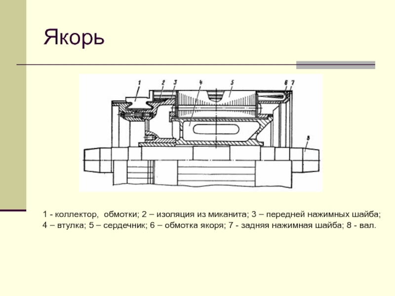 передней нажимных шайба; 4 – втулка; 5 – сердечник; 6 – обмотка якоря; 7 - задняя нажимная шайба; 8 - вал.