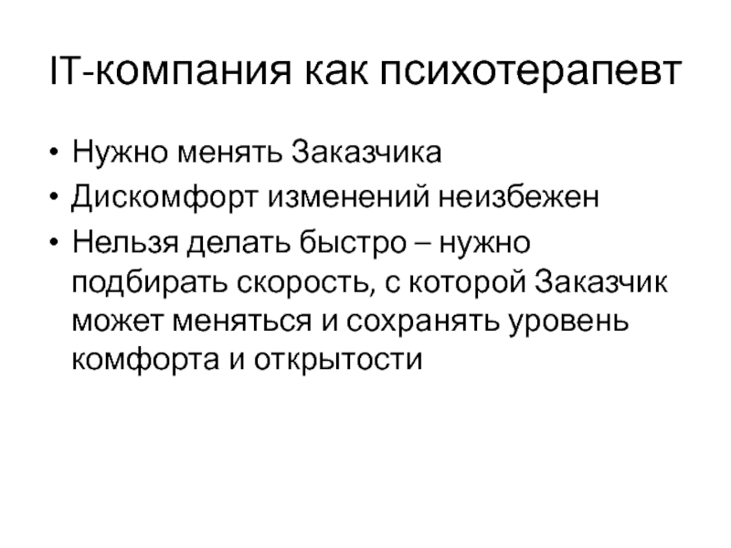 подбирать скорость, с которой Заказчик может меняться и сохранять уровень комфорта и открытости