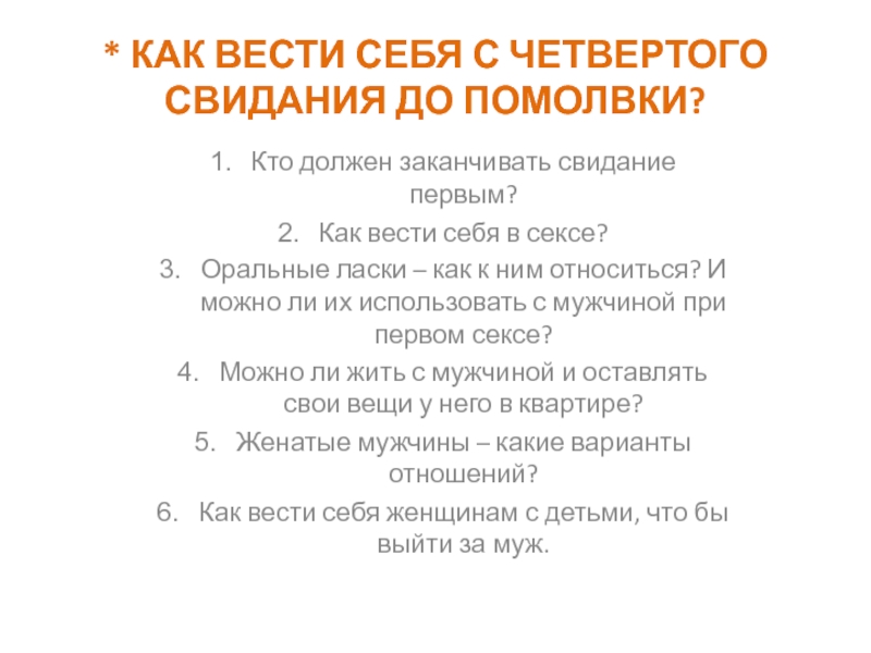 Слайд 71* КАК ВЕСТИ СЕБЯ С ЧЕТВЕРТОГО СВИДАНИЯ ДО ПОМОЛВКИ?
