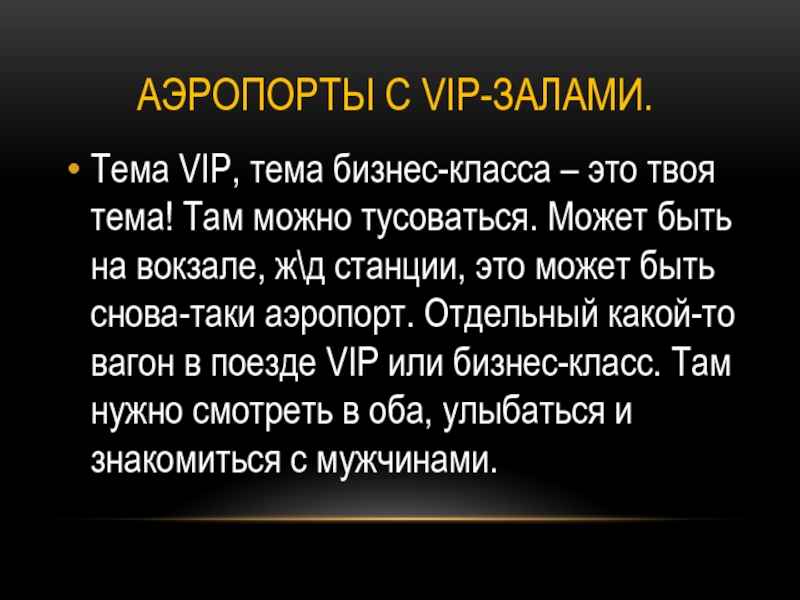 – это твоя тема! Там можно тусоваться. Может быть на вокзале, ж\д станции, это может быть снова-таки аэропорт. Отдельный какой-то вагон в поезде VIP или бизнес-класс. Там нужно смотреть в оба, улыбаться и знакомиться с мужчинами.