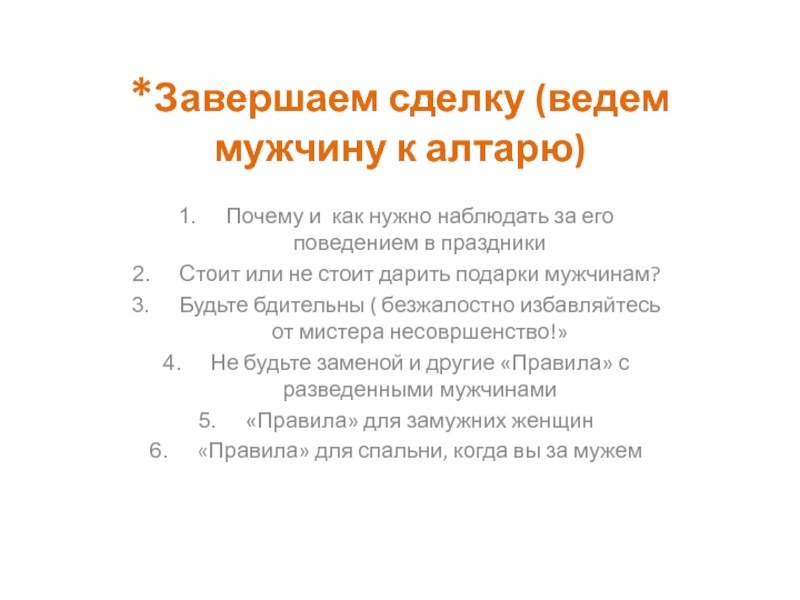 Слайд 73*Завершаем сделку (ведем мужчину к алтарю)