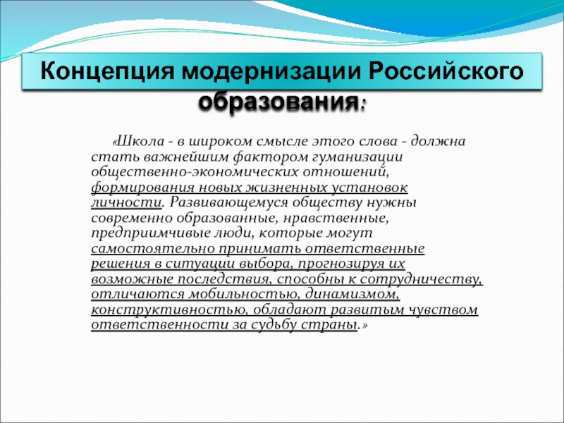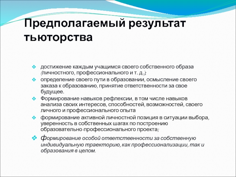 пониманию смысла своей жизни, индивидуально-ответственному поведению. Реализация творческого потенциала в духовной и предметно-продуктивной деятельности, социальной и профессиональной мобильности на основе непрерывного образования и универсальной духовно-нравственной установки – «становиться лучше»;