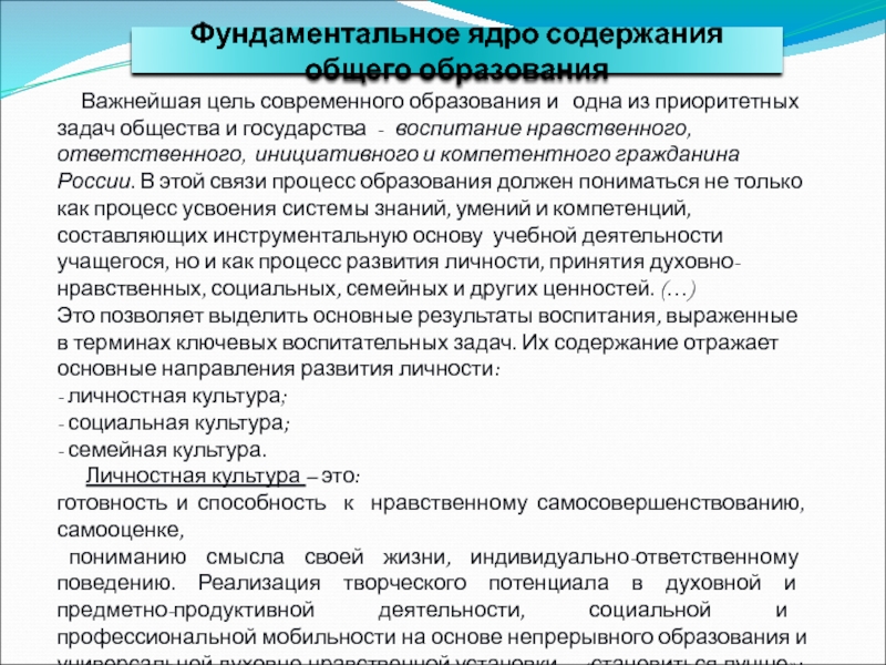 приоритетных задач общества и государства - воспитание нравственного, ответственного, инициативного и компетентного гражданина России. В этой связи процесс образования должен пониматься не только как процесс усвоения системы знаний, умений и компетенций, составляющих инструментальную основу учебной деятельности учащегося, но и как процесс развития личности, принятия духовно-нравственных, социальных, семейных и других ценностей. (…)