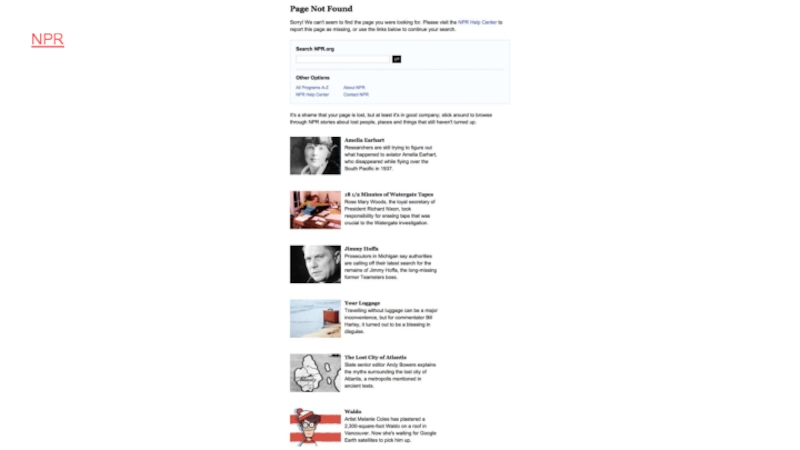 Будьте полезными и предоставьте ссылки на возможные совпадения. Если пользователи оказались на ненайденной странице, они, вероятно, что-то искали. Так помогите же им это найти. Разместите на странице меню или ссылки на недавно перемещенные страницы. Или почему бы не дать ссылки на самые популярные страницы Вашего сайта? Либо на самый новый и актуальный контент. Так или иначе, пользователи должны быть не более чем в одном клике от перехода на какую-либо другую страницу сайта. И, конечно же, всегда давайте ссылку на главную страницу.