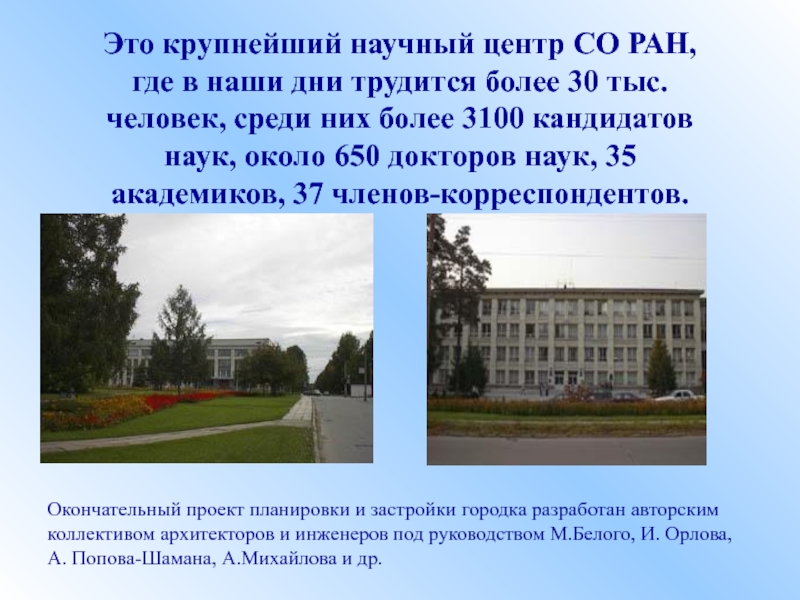 Окончательный проект планировки и застройки городка разработан авторским коллективом архитекторов и инженеров под руководством М.Белого, И. Орлова, А. Попова-Шамана, А.Михайлова и др.