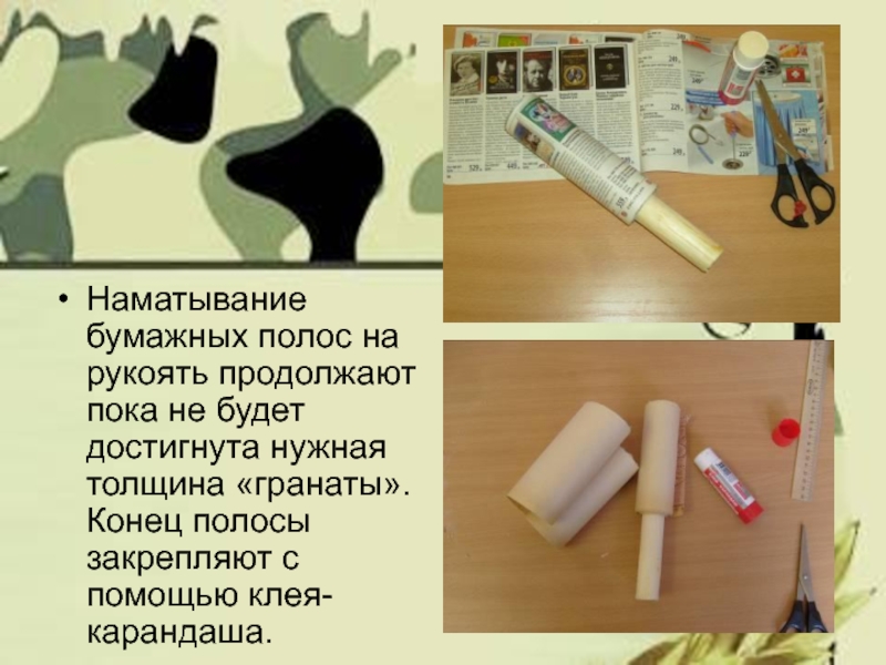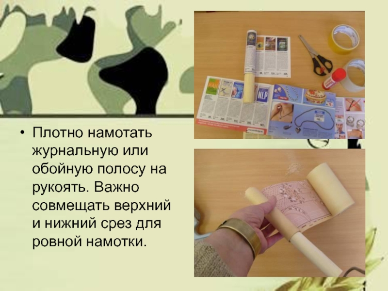 Слайд 7Плотно намотать журнальную или обойную полосу на рукоять. Важно совмещать верхний