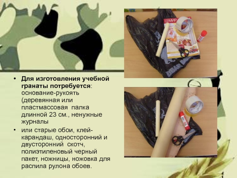 Слайд 3Для изготовления учебной гранаты потребуется: основание-рукоять (деревянная или пластмассовая палка длинной