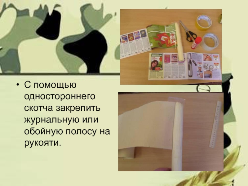 Слайд 6С помощью одностороннего скотча закрепить журнальную или обойную полосу на рукояти.